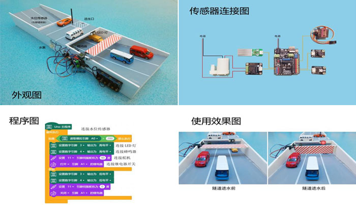 本创意通过在隧道内安装主控器做为大脑;安装水位传感器,测量水深,做为输入;设置一个数值,做为水位传感器的触发条件;安装红色Led灯、蜂鸣器、舵机、水泵做为输出执行来实现想要的功能;另外加装一个逃生梯。
