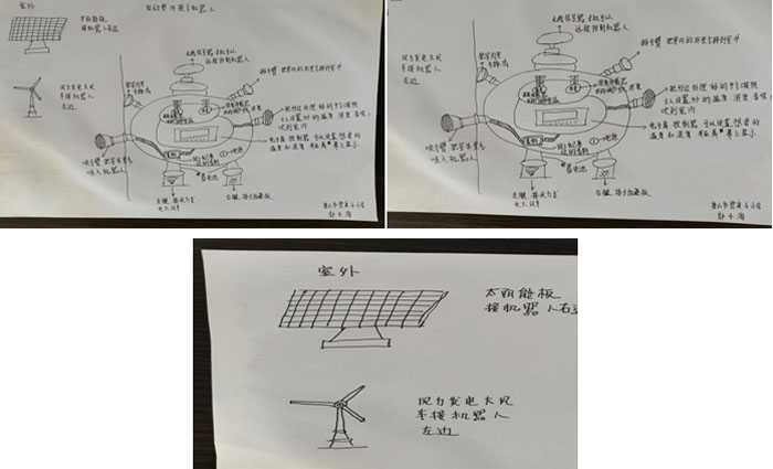 这台机器利用了太阳能、风能发电原理为自动室内换气机器人提供动力,计算机程序控制原理提前设置自己需要的室内温度、湿度,机器人根据温度湿度传感器获取的数据将适宜的空气送到室内。通过头顶的无线信号器获取网络信号,达到远程控制的功能。