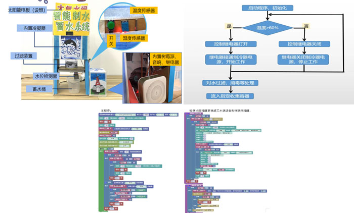 智能制水蓄水系统由工作系统和控制系统两部分组成,工作系统由整体防护外壳、冷凝装置(制水主体装置)、净化过滤装置、蓄水瓶、太阳能电板(供电)组成;控制系统在主体左侧,内置继电器、湿度传感器、180舵机、按键、水传感器、树莓派智能元件。