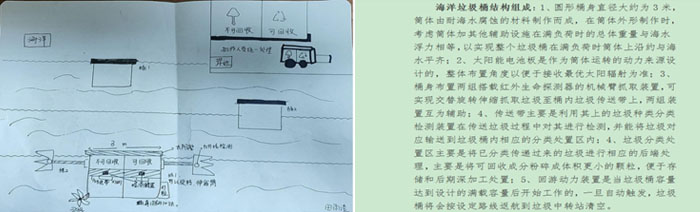 我们所消耗的每一片塑料,都有可能流入大海,漂浮垃圾严重影响着海洋生态。如何方便及时回收、再利用这些塑料垃圾是一个值得思考问题。我设想一种海洋垃圾桶,希望它可以自己检测并收集海洋漂浮的垃圾,并进行基础分类,将可回收的塑料集中收纳并直接打粒处理;当满载荷时能够自动回游,节省人力物力,还大海一片蔚蓝。要解决的问题是海洋垃圾桶的各个功能:检测生命非生命物体、抓取、检测分类、自动分区存放、打粒、自动回游等。