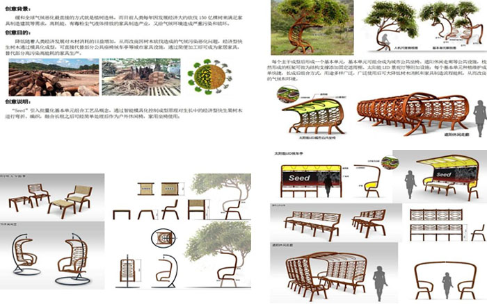 更加绿色环保的城市家具及部分家居用具的新形态替代设计,利用树木的细胞分裂生长原理、人工干预成型的办法,“种出”需要的形态,减轻大量工业加工产生的消耗,“种出”自然的城市生态环境。