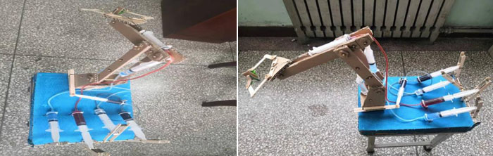 3.转换器里放入不同颜色的液体,能清楚分辨不同功能,如黑色是控制转换器的旋转功能;透明颜色是控制抓手的起降;红色是控制抓物品的力度;蓝色是控制装置的起降;