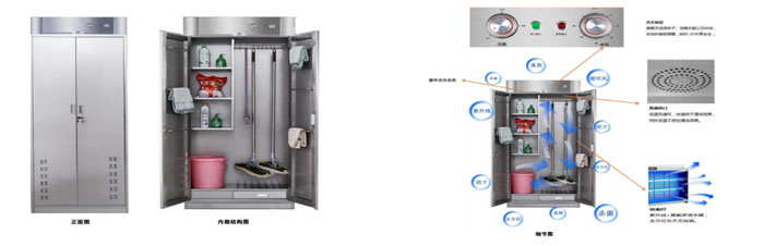2.收纳柜右边顶端设风循环口,低温循环风,不损伤清洁用具,且可快速风干清洁用具。