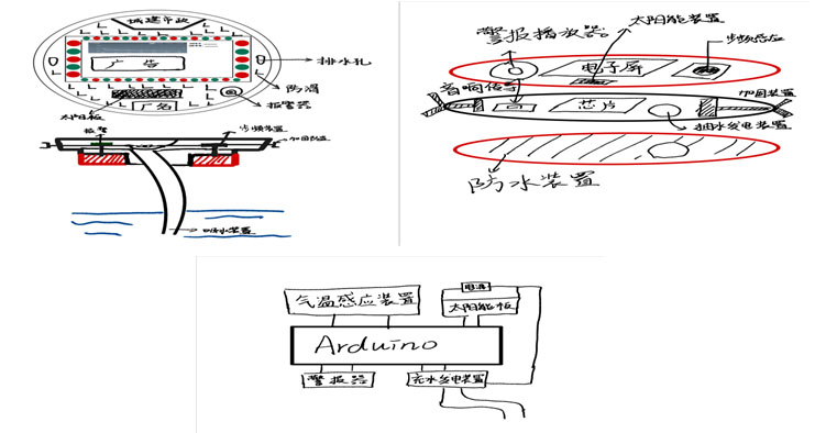 通过太阳能装置获得能源,LED显示屏提供不同地域气候查询界面。利用不同传感器,监测步频震动的正常与异常,报警提示人们危险情况。利用水位检测模块,水位距离井盖10厘米,井盖会立即感应报警。井盖通过自检功能,出现问题,随时向后台发出信息。