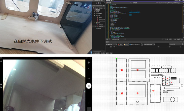 本作品框架由一个20cm*30cm*40cm规格的教室模型(由木板与亚克力板通过榫卯结构和热熔胶搭建而成)、摄像机、摄像机支架、18cm*26cm液晶屏、液晶屏支架、通电雾化玻璃、用来模拟太阳光的调光手电筒以及手电筒支架组成。本作品电路由电源(220V50Hz交流电)、摄像机、树莓派、通电雾化玻璃膜以及相应导线构成。
