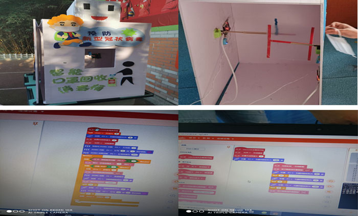 由三部分组成:用一个micro:bit掌控板控制舵机完成门的开关、彩虹灯带(紫外线消毒),另一个主控板控制利用舵机制作的机械臂。用于悬挂口罩;以及一个感应消毒器。