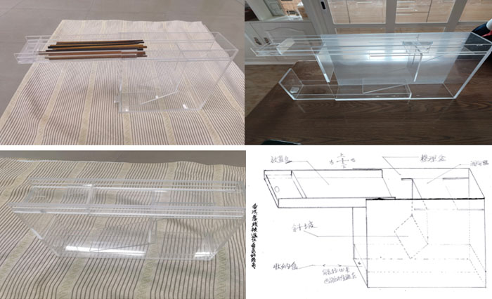 运用了筷子重心不在中心位置的原理,通过极其简单的动作,在一个方向上实现了无序摆放的筷子因重心在两个不同位置而分批掉落的现象和斜坡引导,可以实现摆放无序的筷子自动整理成大小头一致的目的,这就是我发明的“筷子自动整理盒。材料使用透明亚克力,整件作品结构清晰,一览无余。