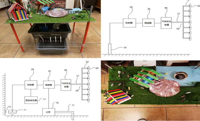 气体发生装置可与水泵同时启动,对应的只需要将湿度感应器和红外感应器的相对高度设置成等高。 红外感应器和湿度感应器设置在不同高度,低位阶段红外感应器感应到浮漂后启动强排水,增加内涝排放速度。当水位继续上涨,湿度感应器启动气体发生装置准备逃生