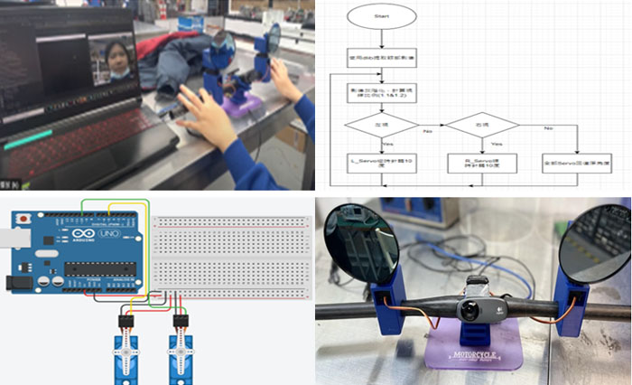 本作品利用眼球的運動角度來調節後視鏡的角度。先探究捕捉瞳孔運動的技術,計算後視鏡反射光線的可視範圍,再利用舵機對後視鏡進行實際的角度調整,有效降低騎手駕駛危險。