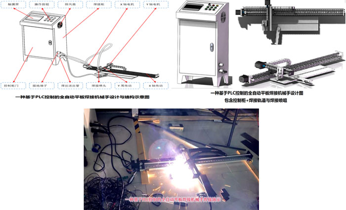 PLC控制的全自动平板焊接机械手主要由:1.控制系统、2.焊接系统、3.传动系统、4.人机交互系统四大系统组成。