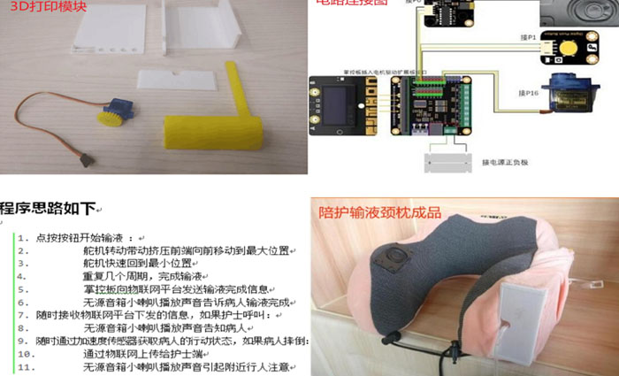 本作品将输液袋和颈枕有机融合在一起,采用掌控板作为主控板,使用360°舵机带动3D打印的齿轮传动结构以挤压输液袋,使用掌控板自带的加速度传感器判断病人是否摔倒,使用物联网(掌控板集成ESP-32芯片)上传病人的输液状态和行动状态(摔倒与否),下发护士端命令,使用音频录放模块和无源音箱小喇叭提醒病人输液完成与传达护士的呼叫。