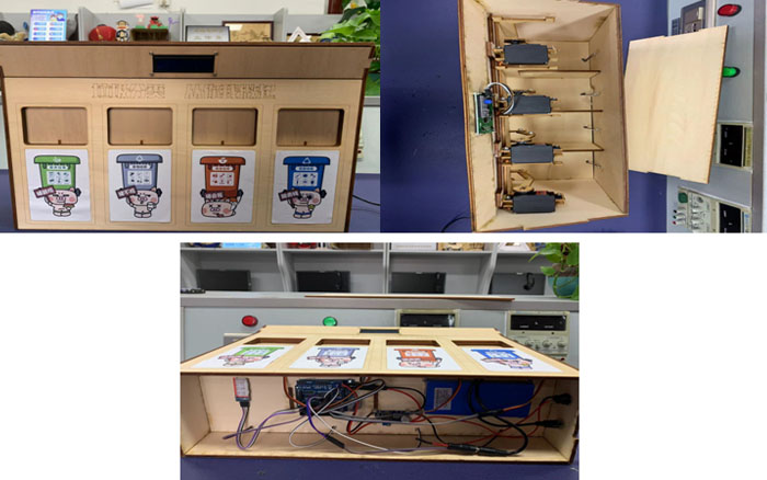 作品能帮助用户了解关于垃圾分类的知识,通过语音识别、智能控制垃圾箱盖的开启等功能,快速准确的识别垃圾类型,实现无接触投放,既安全又卫生,增强用户保护环境意识。