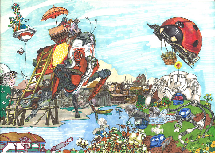 作品创意说明:这幅作品中,我想象我努力学习科学知识毕业后回到爸妈身边,我看见田野里的瓢虫,就动手制作了一个瓢虫飞行器。爸妈骑在高高的蚂蚱机器兽上,机器兽的灵感来源于大象和蚂蚱,爸爸遥控着瓢虫飞行器运小麦,多功能机器人大白的机械臂伸出长长的副手臂拔树、捡垃圾,蓝色功能车跟在后面在耕地。另一辆功能车正在推土,机器大白侦测到伸出水管放水,人工河就修好了。探测到苹果熟了,大白伸出探头摘下放卡车里。卡车开进大白的肚子仓库。蚊子型仿生机器人在收割棉花。我的小发明让爸爸妈妈种地不再辛苦,还迎来了大丰收。