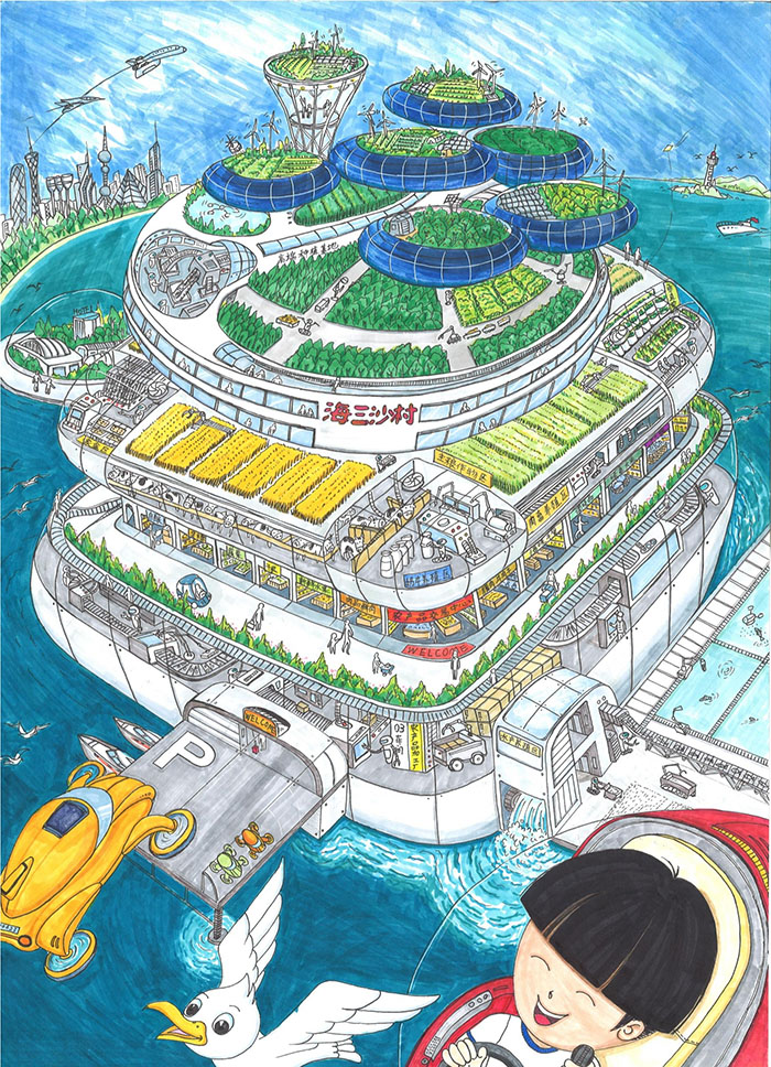 作品创意说明:地球耕地空间是有限的,在海上可以构筑新的一体化科技农村。这是美丽又充满魅力的移动村庄,集科技自动化的农业生产、农产品加工和特色旅游一体化的新农村形态。有住房、农场、景观、商业、旅游,完善的新能源系统,生活所需应有尽有。顶层上区种植经济价值高又具观赏性的作物,是空中观光住宅区。下区是生活娱乐区。中层上区种植主粮作物,下区养殖禽牧和垂直农场,生产蛋、奶、肉及蔬菜等。配有粪便回收肥料生产及沼气能转化系统。下层上区有休闲观光及农产品交易中心,中部农产品加工厂区,附带海产养殖场,底部配总动力及海水淡化系统。科技让农民不再需要世代时刻守着土地,带上村庄就可以坐地日行,在自家稻田里也可以看诗和远方。