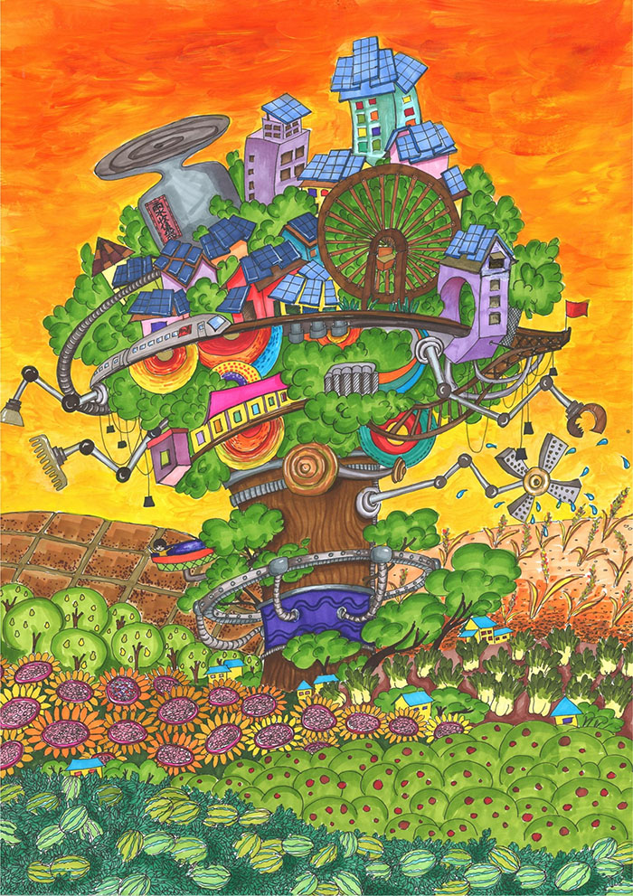 作品创意说明:当今农耕土地与人类城市发展的冲突日益明显,如何将环保、生态和科技进步三者统筹协调和平衡,是急需思考的问题。在我的畅想中,未来将会有一棵生命之树,它能让城市与农田形成空间层叠,用最环保最科技的方式全自动耕作。树上城市拥有最先进的雨水收集转换器,所有房屋具有超高效太阳能装置为城市提供能源。生命之树最大的功能是将人类活动与有机农田之间形成空间区分,将耕作土地最大化、自然化、智能化。它能将雨水收集器中的水分输送到灌溉器,为农田灌溉。将城市生活废弃物和污水转换成耕作养料,通过喷洒器对农田进行施肥。还根据农作物初成熟度数据分析,进行数字化收割,彻底解放了双手,节省人工劳作,实现自然环保美好生活。