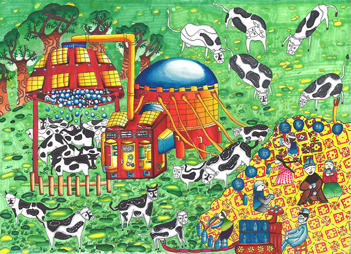 作品创意说明:我的家乡在新疆,有着美丽的大草原,这里牛羊成群,畜物业非常发达,牛、羊的产奶率也特别高,但采集非常的麻烦,而且不宜保存。我的创意是发明一款能通过牛、羊奶采集、检测、加工的一体机,通过机器人操作来挤奶,并自动检测奶质的好坏,检测完后直接把它们加工成各种奶制品,更好地解决了牧民的困难。