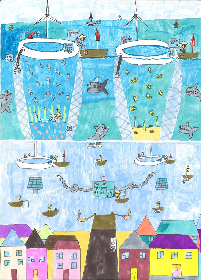 作品创意说明:美丽的海南岛,是我的家乡。这里有大量沿海渔村和渔民他们常年靠捕鱼为生,丰富的海特产是大海的馈赠,然而这样小规模的生产作业让渔民们的生活过得并不算安稳,也不算富裕,常常会因为台风和季节等原因不能捕鱼。我希望家乡的海村能够在科技的帮助下,建设成现代化的渔村,通过海洋牧场更科学的大规模养殖海产品,让家乡的人民更加富裕。现代化的渔村,应该有整齐干净的街道和房屋,家家户户都用上了自来水、电和5G网络。渔民们共同建设海洋牧场,这里的海洋牧场可以依靠太阳能板风力发电等自然能源满足海洋牧场绿色用电的需要;有最先进的5G网络设备,将海洋牧场围本兰里发生的一切及时传达给渔民们知道。海洋牧场的围栏里有丰富的传感器和水下监控仪器,这些设备可以感知海洋的环境变化、外来入侵的危险、鱼苗的生长情况等,通过科学化的人工智能分析算法将分析结果、和监控画面传到渔民们的智能终端上进行查看。好!在新兴科学技术的帮助下,希望我们的海洋更加美丽富饶,渔村人民的生活更加幸福美丽。