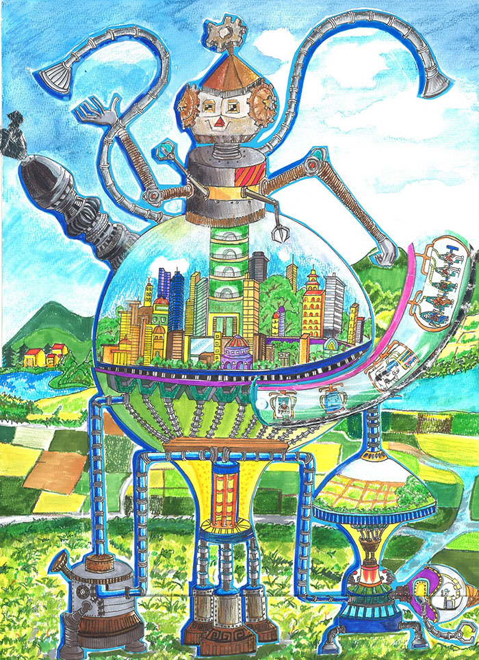 作品创意说明:在全球气候变暖的巨大危机下,人类发明了生态乡村智能机器人。它的出现使乡村生态更加完善。首先,机器人的腹部可以容纳一个3万人生活的城市,城市的土壤,陆地下面有无数根能量输送管道,便于将外界空气,水源输送进城市内部,在这些管道的顶部又布满数千个转换器,可以将城市排放的二氧化碳通过城市底下的集成收集系统传输到机器人的过滤系统中,再生出新的动力燃料,帮助机器人外的乡村建设。巨大的可再生材料透明罩可以阻挡城市的碳排放。在机器人之外的地方耕种生态农田,由于城市的污染得以控制,生态农田的合理利用也大大改善了生态系统,雾霾不再卷土而来。机器人还可以通过河流的水源补给,净化出绿色无污染的有机稻田,这里的有机稻产量是生态稻的三倍。底部的真空传输轨道用于农场动物研究,繁殖,为乡村畜牧业创造绿色有机的生态条件,还可以用于人类进出城市的交通轨道,一举两得。