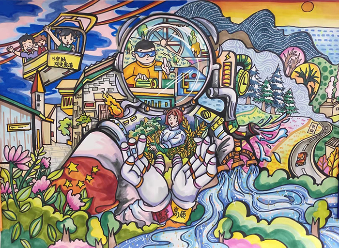 作品创意说明:画幅中央描绘了宇航员大大的脑袋,科研人员运用未来高科技种植高产高质的农作物,给人们带来了丰收的喜悦。而另外一个支线的主题则是乡村整体规划,房屋整改,道路重建,因地施策,将家乡变为美丽的可供游客参观的旅游景区。整幅作品以高科技为主线,贯穿起乡村的金山银山和绿水青山。