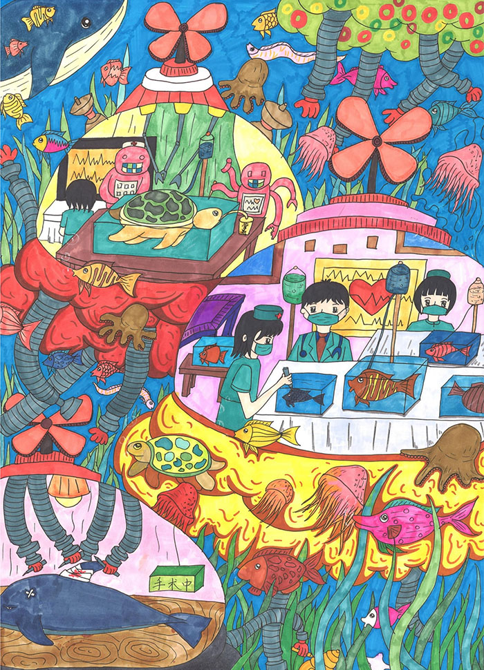 作品创意说明:大连是一个沿海城市,我们有丰富的海洋资源,但是由于人类对大自然的破坏,导致大海受到了污染,许多海洋生物都生病了。因此我想要组建一支海洋医疗救援队,这个救援队由一个个潜艇组成,他们深入到海洋当中,利用雷达感应生病的海洋生物,将它们通过潜艇下方的管道吸到潜艇当中,在潜艇当中根据它们的病情给予相应的治疗,救援队当中的潜艇分为手术潜艇、观察替艇、诊疗潜艇。雷达感应到生物的不同病情,将它们吸到相对应的潜艇当中进行救治。待它们治愈后放回大海。海洋医疗救援队可以救助海洋中生病的生物,帮助我们改善海洋资源,人们能够与大自然和谐相处,爱护环境,爱护动物,爱护海洋,使我们的城市更好的发展。