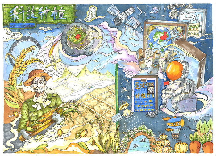 作品创意说明:这幅画我想首先想致敬袁隆平爷爷,袁隆平爷爷他研究出的杂交水稻,让全世界的人们都吃上了饱饭,以及他已经研发的海稻,我想以后我们可以,把稻谷种到星球上去,就如同小王子的故事里,每个星球都可以有不同的人,每个星球都有不同的的气候,我们因地制宜,种植不同的稻谷,蔬菜.而且我想在画中加上达利先生的扭曲的时钟,我们虽然改不了时间流逝的速度与方向,但是我希望我们可以以用美好的想象力把一切事物变得柔钦,把袁隆平爷爷留给我们的一切留在时钟里,并且,画里有飞着浇水的卫星,有飞艇播种,种出的南瓜还致敬了画家草间弥生奶奶,我想对于古人言嫦娥奔月是神话可我们已经实现,而太空种相植技术一定会实现在不久的将来。