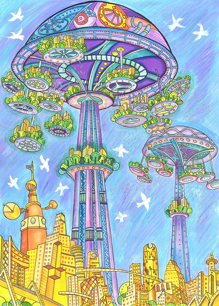 作品创意说明:在未来,科技日新月异的摩天大楼上围着层层圈圈新型植物,这些植物不仅能净化环境,也能吸收病毒。 植物底下的这台自制循环造水功能,更是能降人造环保雨,让世间的空气格外清新。