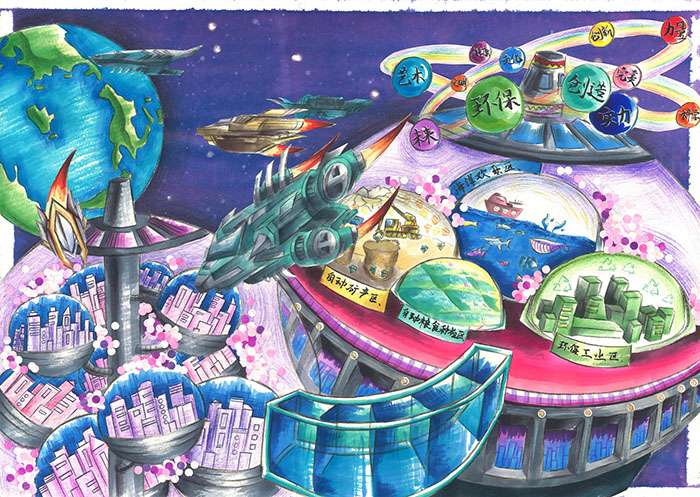作品创意说明:在4444年,人们可以飞上太空,并且登陆月球。现在人们不仅仅是在地球上生活了,在太空中建设新的家园。太空中悬浮着两个“新小行星” ,人们称它为--当代桃花源。 在里面划分出了五个区域:居住区、自动矿产区、环保工业区、自动粮食种植区以及海洋欢乐区。之所以要划分区域,是为了环保。在以前的地球村,工业污染非常的严重,用浑浊的污水,堆积如山的垃圾和漫天的灰尘攻击人类。使得城市以及海洋的环境陷入一片黑暗。现在的人们意识到污染的严重性,将区域划分开来,并且让工业区域的环保起来,让矿产区和粮食种植区自动化。让城市和海洋环境变得更加美丽!当代桃花源,人们所向往的新世界,每个人从小事做起,哪怕只是捡起一张小纸屑都是在给自己的家园添一份光彩。
