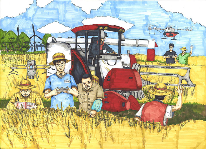 作品创意说明:新时代的今天,现代科技与传统农业日益融合。收麦车、科技员、还有广袤麦田上的无人机等,都带给了乡村更高效,更优良、更先进的农业生产技术,让人们的生活更加美好幸福。