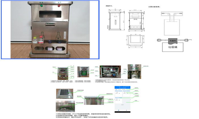 以40L容积垃圾桶为例,将垃圾桶的装载能力提升至1.3-1.7倍,减少运送垃圾的运输成本;清洁人员可根据手机app的提示信息调整工作,提升清洁人员的工作效率,减少了垃圾桶溢出无人知晓的情况发生,优化了环境;独立水瓶回收框和独立电池回收桶,促进人们垃圾分类的意识形成。
