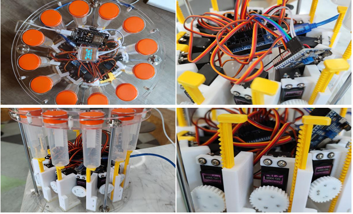 智能药盒刚通电时,会自动开启装药模式,顶部的12个密封试管会逐一弹出,这时候将药物根据服药时间顺序逐一放入到密封试管中。装药模式结束后,密封试管会逐一下降,直到全部嵌入到亚克力板中。试管只有到了设定好的时间才会自动弹出,有效避免忘记吃药、吃错药、重复吃药的情况。