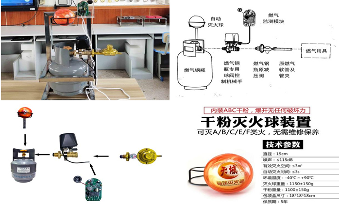 首先是双重防护:液化气泄漏时,会自动触发报警装置,第一时间关闭阀门;若意外情况引起失火,装置会启动第二重保护,灭火球自动灭火。