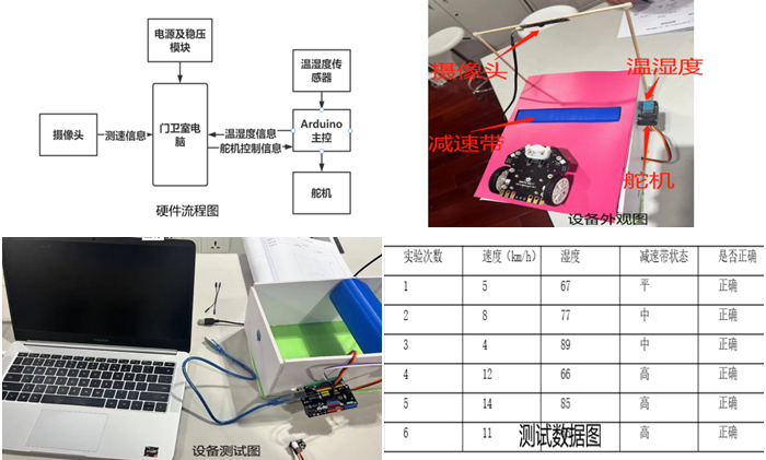 1.自适应减速带的方案设计。本项目运用摄像头、温湿度传感器、舵机以及Arduino等硬件,结合AI模型python编程,实现了对减速带的自适应控制。