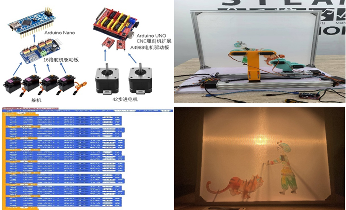 一个由步进电机与舵机组成的机械装置,与皮影戏幕布与纸板剪制形象相结合组成的智能装置。