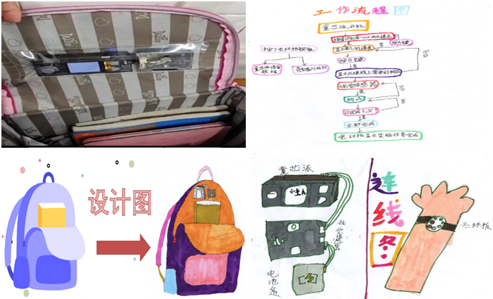 童芯派显示并播报天气和出现对应的课表。按B键,显示出需要带的物品清单,用摄像头扫所需物品条形码,童芯派上显示的物品区域显示“已完成”。当所有物品都扫码放进书包了,童芯派说:小主人,你已整理好书包。二、紧急救援功能。当遇到校园欺凌的时候,按下手环光环板按钮,光环板显示报警灯,童芯派立即播报:救援人员已到达。来驱赶坏人作用