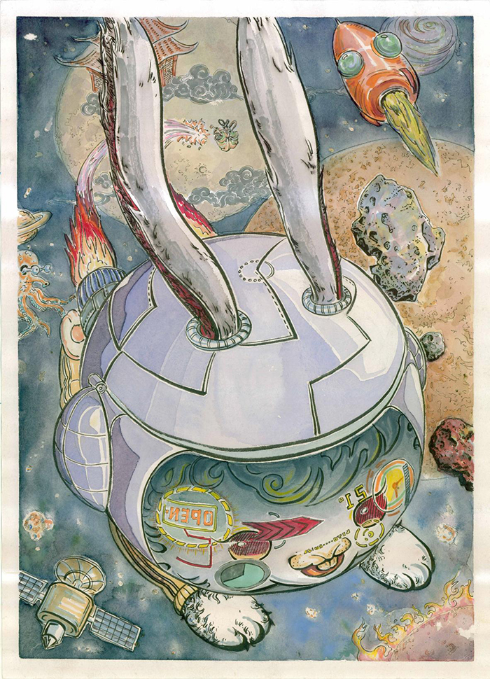 以“逐梦深空”为主题,作品将中国传统神话《嫦娥奔月》中的玉免与科技所结合,玉免凭借现代科学技术,穿上字航服飞离了月球,是传统文化与现代科技的碰撞文化底蕴彰显文化自信,文化自信驱动科技创新,人文是根,科技是花,根基稳固才能花繁叶茂。