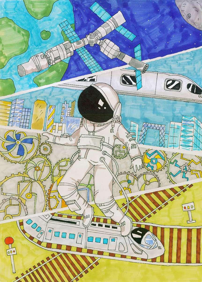 多少个日日夜夜,我梦想着,我会飞翔,脚下是一望无际的宇宙,我遥望着美丽的地球。飞船是我们的交通工具,在这里空气清新,人与自然和谐共生。