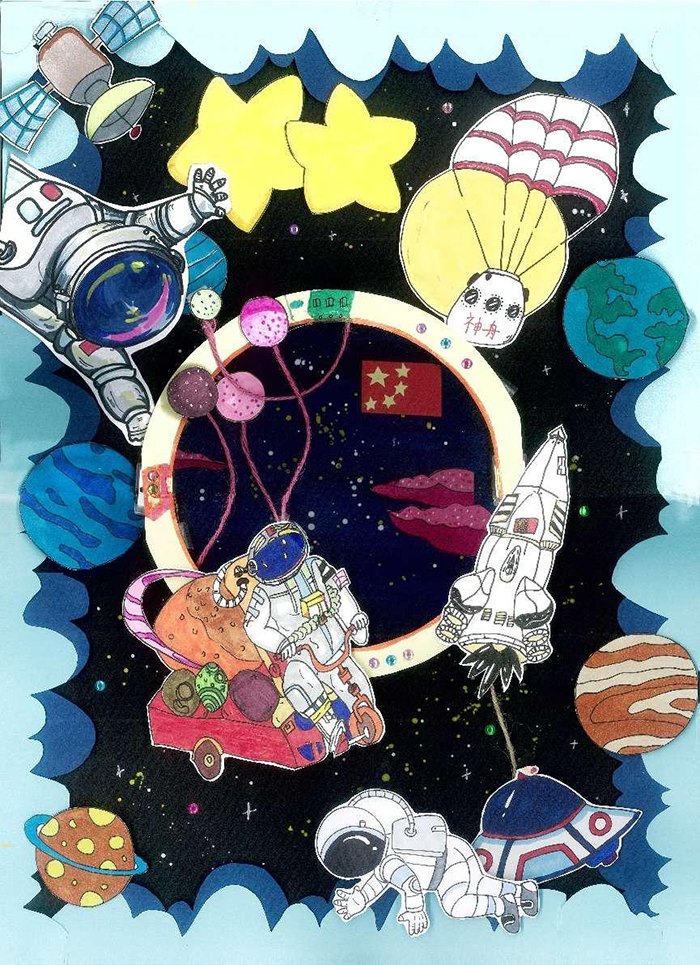 浩瀚宇宙,神秘太空。星星代表着梦想,代表着我国航天事业的伟大梦想,这名宇航员在大太空自由翱翔,火箭“飞天一跃”将不断指引我们去击破万里苍客,充分体现了我国不断探索太空奥秘的愿望。邀游太空,让梦想起飞。目标星辰大海,探索永不止步。
