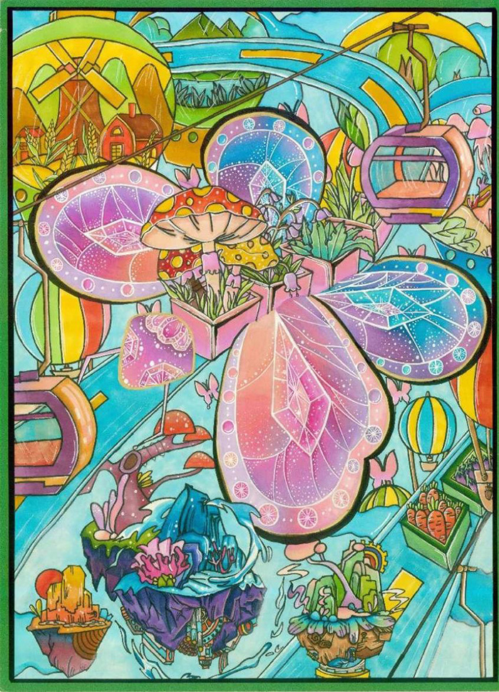 科学家们利用科学技术将地球上的植物种子和动物幼思等通过通过星际蝴蝶运输车、星际生态球、星际生态岛屿等运送到太空,协助改良动、植物的品种,提升产量,更高产、高效的实现地球与各星球间的各种能源、能量输送与转换。在不久的将来太空上的星际飞车可以随时在各个星球来回运输送各种能源、植物等,蝴蝶的翅膀也为天空增添了许多色彩,旁边的几只机械蝴蝶具备美化环境的功能。生态球适合不同品种和生态环境的农作物更好的成长,生态岛屿是为了美化天空的环境,并可以净化空气,让空气不受污染破坏星际缆车、星际热气球可以方便地球上的人们去各星球自由参观与旅游,未来将拥有充满希望和梦想的宇宙环境。