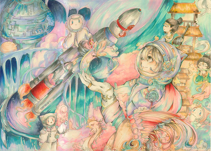 五彩斑潮的太空,像梦境一样美好,带有民族传统文化的人物、器乐和民族神兽朱雀,现代酷炫的飞行器、宇宙飞船、火箭让我们感受到科技的力量。浩瀚的宇宙,有太多神秘的力量等待发掘。而人类对宇宙探索的重任,也终将由我们心怀字宙梦想和求知欲的孩子们来接力。让我们一起飞向天空,探索浩瀚的宇宙奥秘吧。