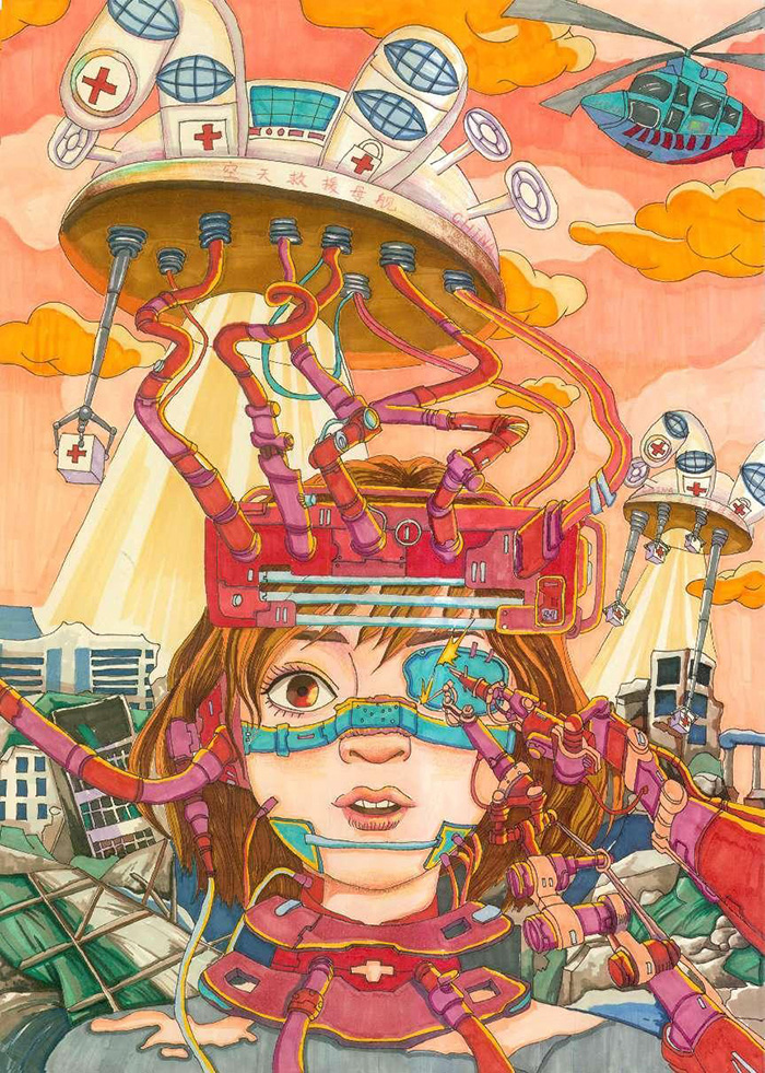 2050年,中国科技取得了举世瞩目的发展,为了保卫人民群众的生命健康安全,空天救援母舰应运而生。空天救援母舰可以在自然灾难、战争以及应急事件发生的第一时间到达救援现场。空天救援母舰通过抛下救援仓将伤员运送至母舰上的医院进行救治和转移,母舰上配备了先进的医疗机器手臂,可以直接对伤员进行手术,母舰上还拥有停靠直升飞机的停机坪,可以承担空中搜救、巡逻、运输等任务。一位头部多处受伤的小女孩正在救援母舰上的医院里,通过医疗机器手臂进行手术治疗,伤情得到有效救治,并且第一时间派出直升飞机进行转移。我相信我们的国家一定是第一个拥有空天救援母舰的国家。